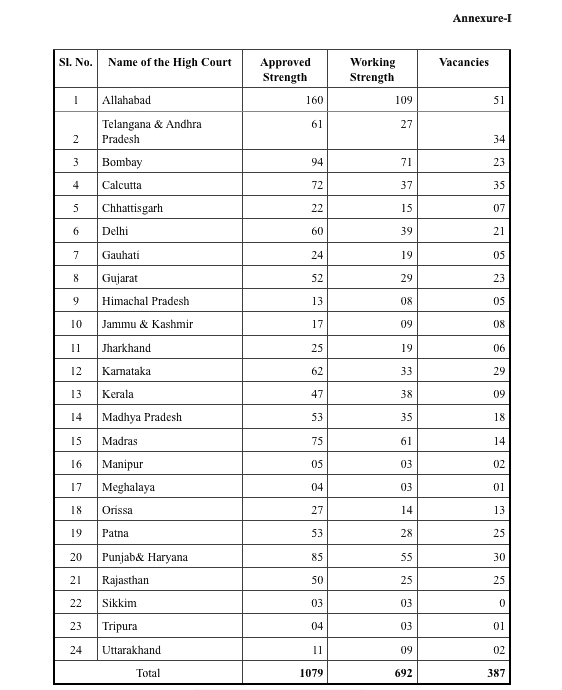 Similarly, Karnataka High Court had 29 out of the 62 approved posts vacant. Other High Courts with a high proportion of vacancies are Gujarat High Court (23 out of 52), Calcutta High Court (23 out of 94) and Delhi High Court (21 out of 60).