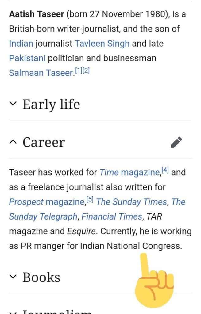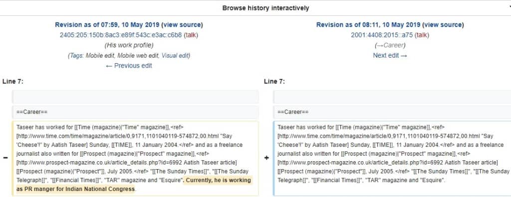 Alt News found that the Wikipedia page of Aatish Taseer was edited repeatedly on May 10. The first edit was at 7:59 am, when the bit about Taseer being “the PR manger for the Congress” was added to the ‘Career’ section of the page.