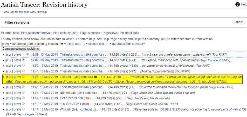 Moreover, Taseer’s page is now ‘protected’, due to ‘persistent disruptive editing’, which means that the contents of the page have now been protected from further malicious alteration due to excessive activity on the page, since the TIME magazine article came out.