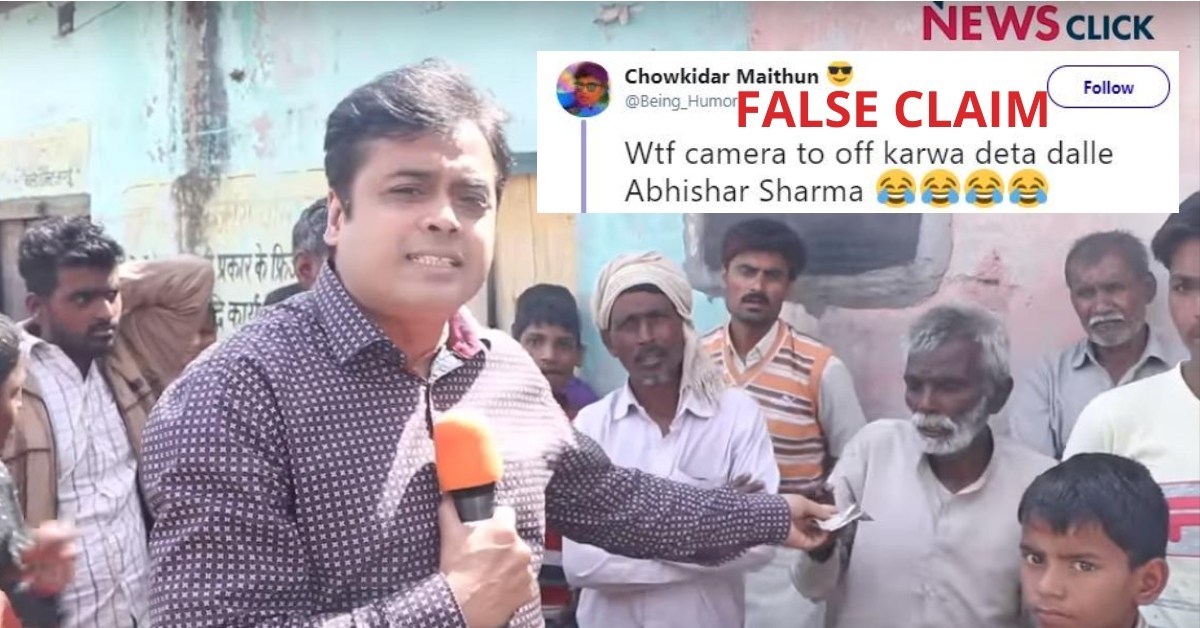 A video clip of journalist Abhisar Sharma has been shared widely on social media. In the video clip, Sharma can be seen handing over a piece of paper to a person while speaking to them about issues regarding the upcoming election. The clip has been shared by several prominent social media accounts, with the claim that Sharma is bribing villagers to speak against Prime Minister Narendra Modi. In the video itself, in the top right corner, the words ‘Abhisar Sharma – Distributing $ to villagers to speak in his favour?’ have been superimposed.