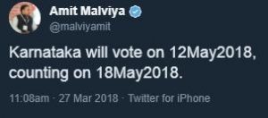 Outrage ensued on social media this morning after users pointed out that the BJP’s IT cell head, Amit Malviya, had tweeted out a schedule for the Karnataka assembly elections before the Election Commission’s announcement.