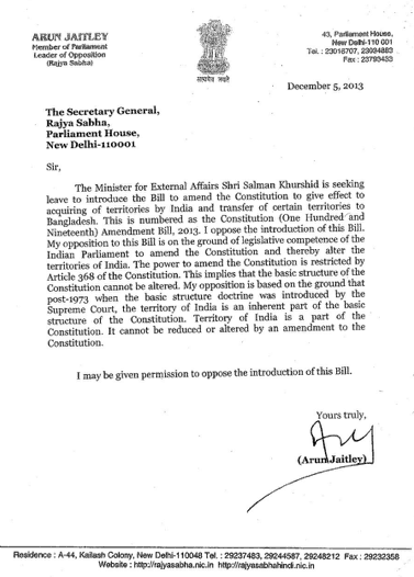 “My opposition to this Bill is on the ground of legislative competence of the Indian parliament to amend the Constitution & thereby alter the territories of India. The power to amend the Constitution is restricted by Article 368 of the Constitution. This implies the basic structure of the Constitution cannot be altered. My opposition is based on the ground that post 1973 when the basic structure doctrine was introduced by the Supreme Court, the territory of India is an inherent part of the basic structure of the Constitution. Territory of India is a part of the Constitution. It cannot be reduced or altered by an amendment to the Constitution”.
