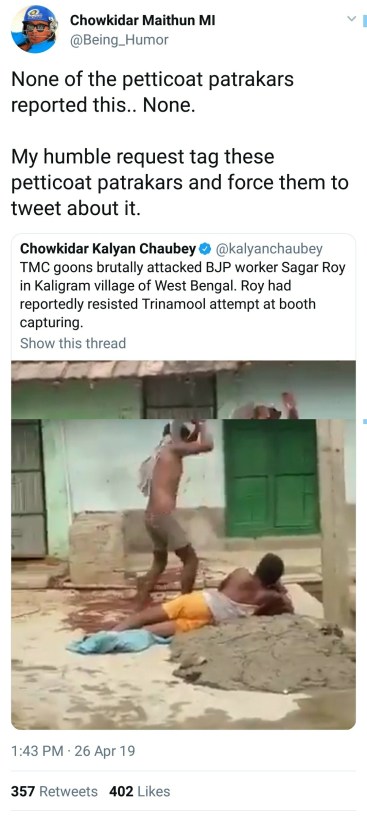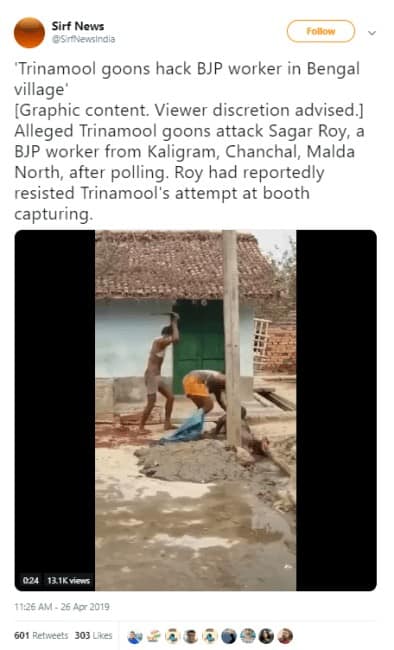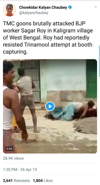 BJP’s Krishnanagar candidate Kalyan Chaubey, a former Indian football player, tweeted a video of two men assaulting a woman and subsequently hacking another man with a sickle. He claimed that the perpetrators were “TMC goons” and the man who was ruthlessly attacked was “BJP worker Sagar Roy” from West Bengal. Chaubey later deleted his tweet but not before it received nearly 30,000 views in less than two hours.