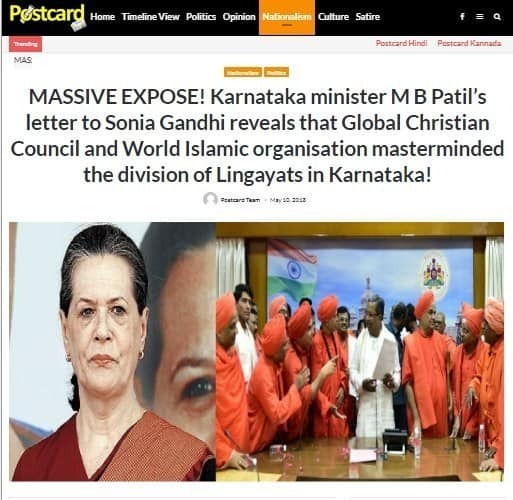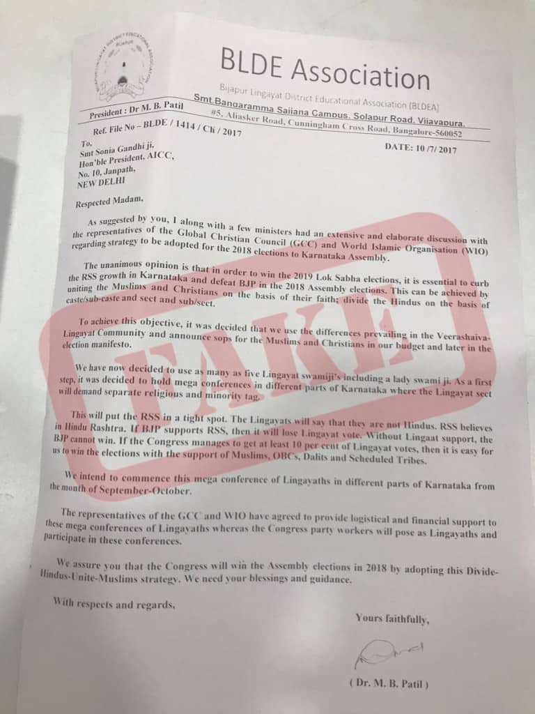 A letter which was purportedly written by Karnataka Congress leader M B Patil to Sonia Gandhi in July 2017, has been shared by the official Twitter handle of the Bharatiya Janata Party (BJP)’s Karnataka state unit. According to the tweet, the letter exposes the divide-and-rule policy of the Congress party which had allegedly fomented division within the Hindu community in Karnataka by pledging a separate status for the Lingayat community.