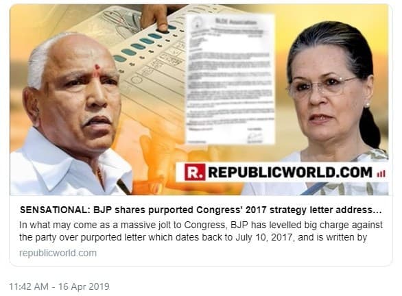 The English news channel Republic TV initially reported about this letter, publishing an article with the words “SENSATIONAL: BJP shares purported Congress’ 2017 strategy letter addressed to Sonia Gandhi pitching explosive caste and religion divide and conquer plan”.