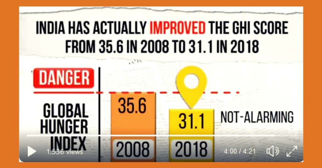 The Bharatiya Janata Party’s fact-check was progressing rather smoothly until they compared the 2008 and 2018 GHI scores and claimed that the country has witnessed an improvement. The video said that India’s 2008 score was 35.6 and in 2018, this number stood at 31.1. BJP implied that the country’s index score has improved by 4.5 points (a lower GHI score implies better performance) in the last 10 years.