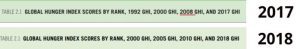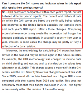 The 2018 report also states that “each report includes GHI scores and indicator data for three reference years in addition to the focus year. In this report, 2018 GHI scores can be directly compared with the GHI scores given for three reference years—2000, 2005, and 2010.”