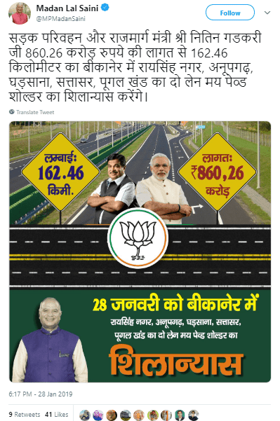 The image was uploaded with the caption – “सड़क परिवहन और राजमार्ग मंत्री श्री Nitin Gadkari जी 860.26 करोड़ रुपये की लागत से 162.46 किलोमीटर का बीकानेर में रायसिंह नगर, अनूपगढ़, घड़साना, सत्तासर, पूगल खंड का दो लेन मय पेव्ड शोल्डर का शिलान्यास करेंगे। (Road transport and national highway minister Nitin Gadkari ji will lay the foundation stone for 162.46 kms of two-lane paved shoulder at a cost of Rs 860.26 crore in Bikaner in Raisinghnagar, Anupgarh, Gharsana, Sattasar, pugalkhand.)”