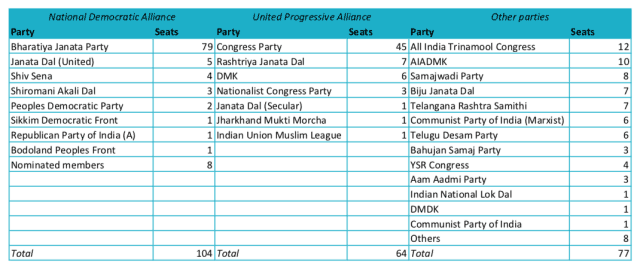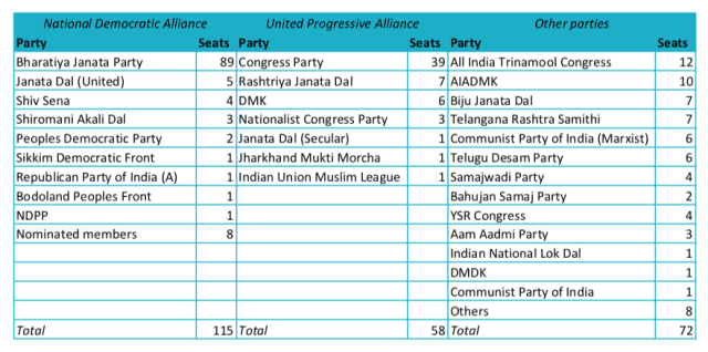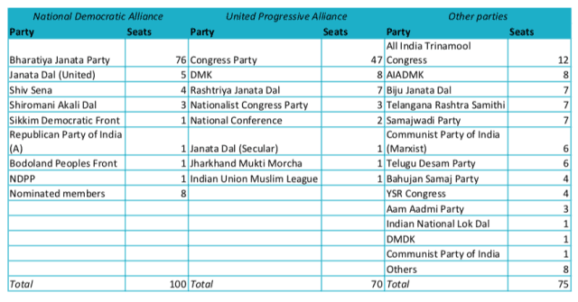 The Bharatiya Janata Party (BJP)-led National Democratic Alliance (NDA) currently has 90 seats in the Rajya Sabha, some thirty short of a majority. If we assume that all current state governments are re-elected between 2018 and 2019 — a very good scenario for the BJP — the Rajya Sabha looks as follows in 2020 (assuming no state legislators cross-vote):