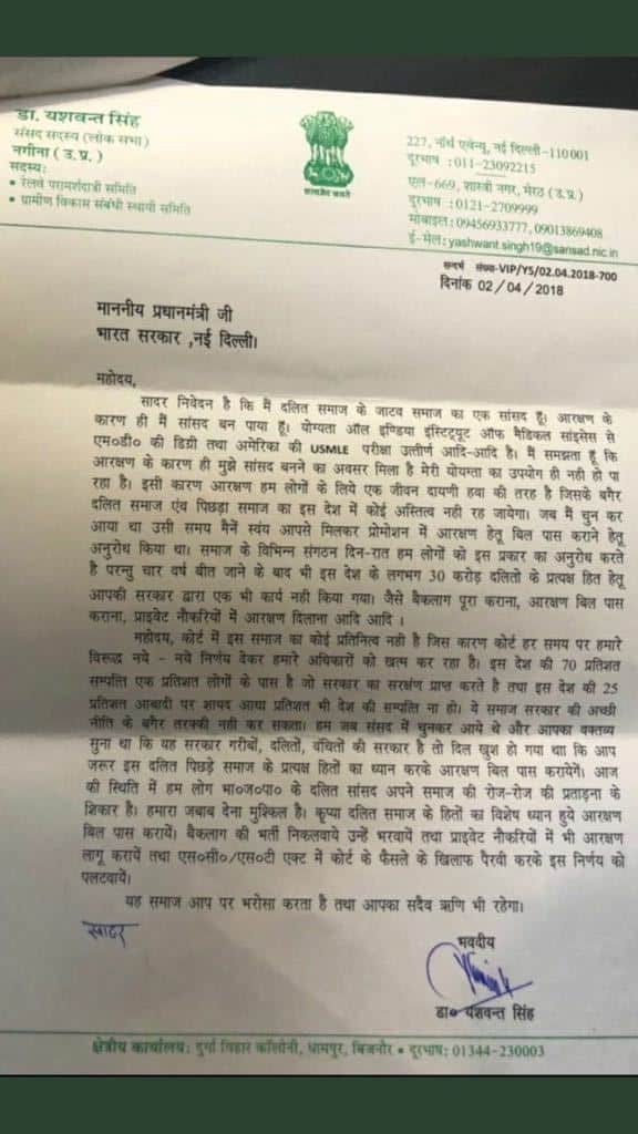 Lucknow: Less than a week after nine people died in protests by Dalit outfits in the BJP-ruled states of Uttar Pradesh, Madhya Pradesh and Rajasthan, the party’s Member of Parliament from West UP’s Nagina constituency, Dr Yashwant Singh, has written to Prime Minister Modi alleging that the U.P. government has been slapping false cases on the educated youths of Jatav community.