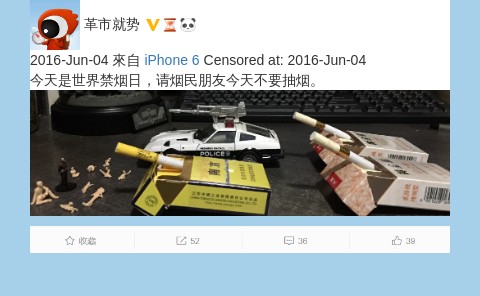 An image of cigarette packages made to look like tanks with a user caption that reads “today is the international No Smoking Day, please don’t smoke”. (Shared on June 4, 2016 and censored the same day.) Image from Weiboscope.