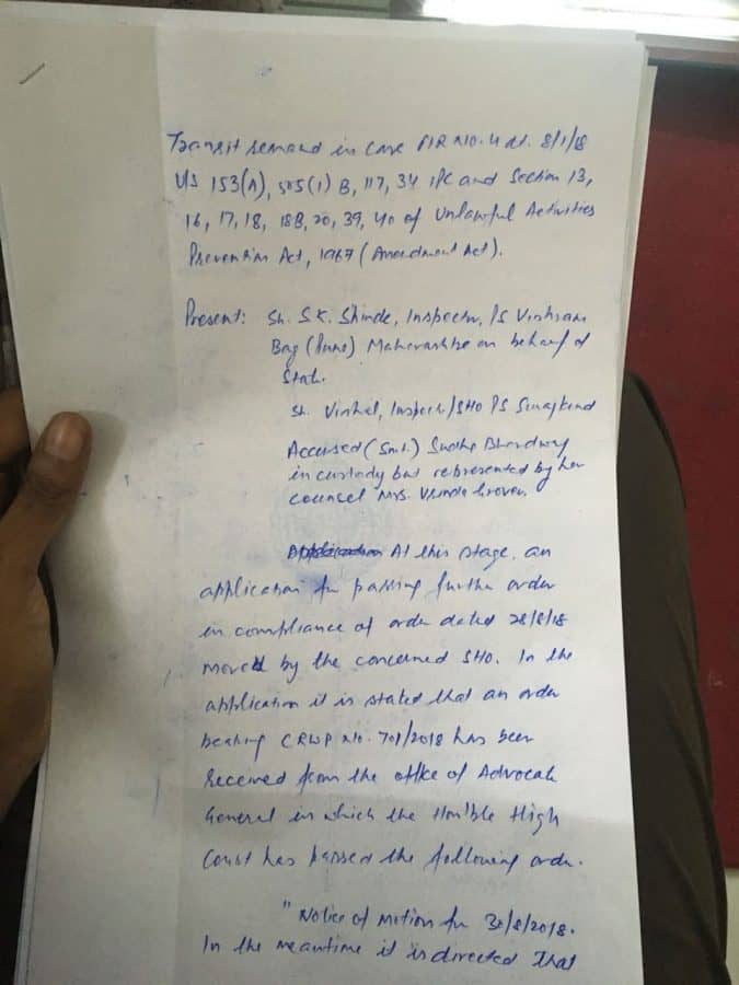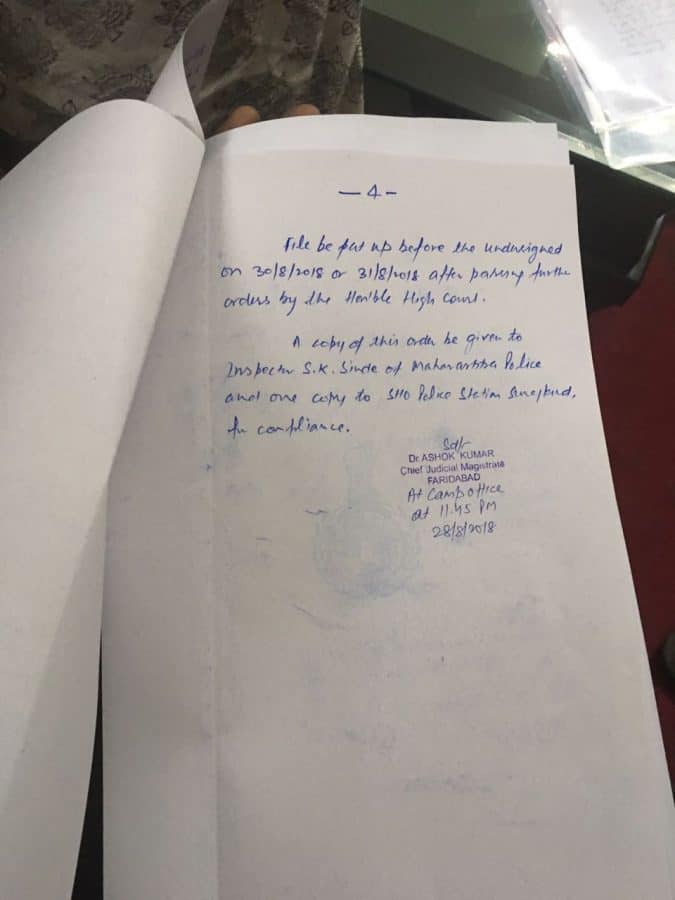 After a prolonged midnight ordeal, sanity prevailed and the CJM wrote “It will be prudent to wait for the orders of the High Court transit remand issued earlier is recalled, Sudha Bharadwaj can go home, for now, till the 30th.”