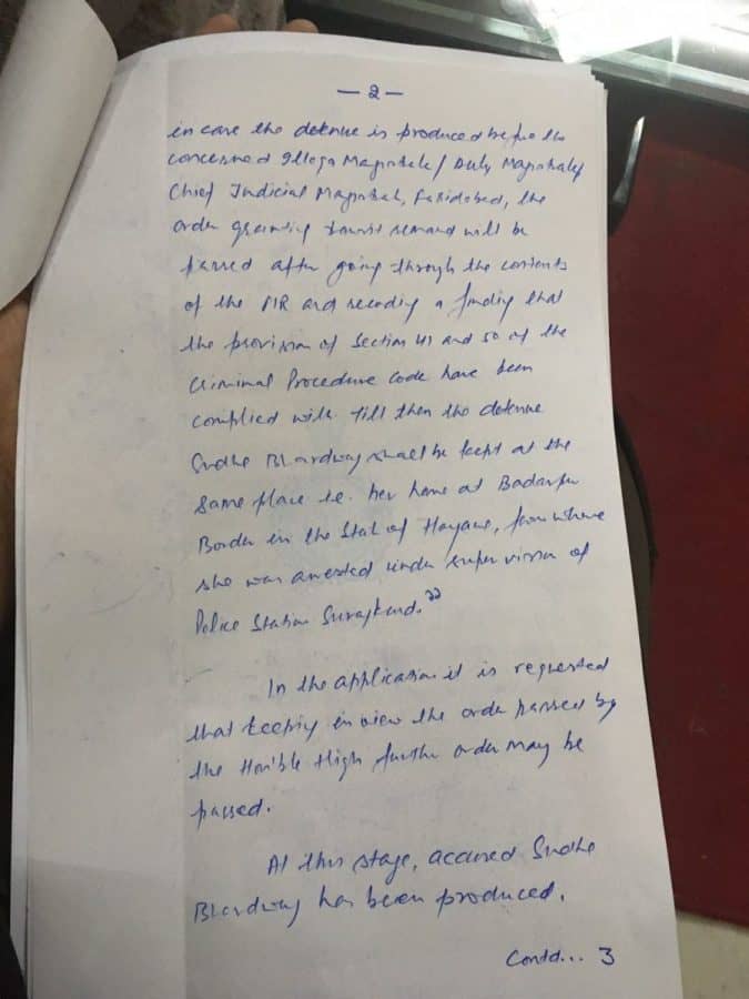 Bharadwaj was taken into custody after police conducted a raid at her Faridabad house on Tuesday morning.