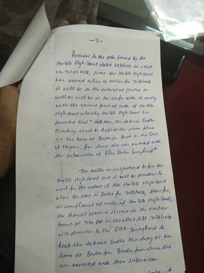 Earlier, the Punjab and Haryana High Court order which granted the transit remand had also directed that Sudha Bharadwaj be kept under house arrest at her residence near Badarpur border. However, Bharadwaj’s advocate Vrinda Grover had written a letter underlining that the police had refused to reveal Bharadwaj’s location, and had not taken her to the residence as per court orders.