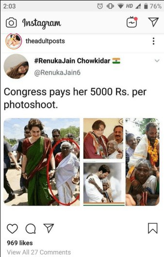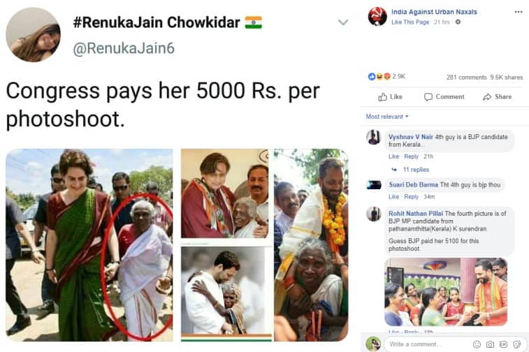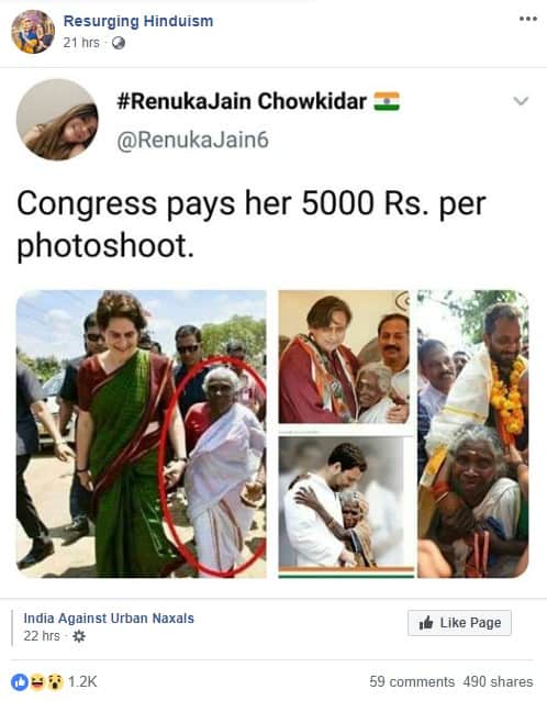 A tweet by Renuka Jain, who is followed by prime minister Narendra Modi, has gained traction not only on Twitter but also on Facebook (archive). In her tweet, Jain claimed that the Congress party had used the same elderly woman for all their photoshoots. “Congress pays her 5000 Rs. per photoshoot,” read her tweet.