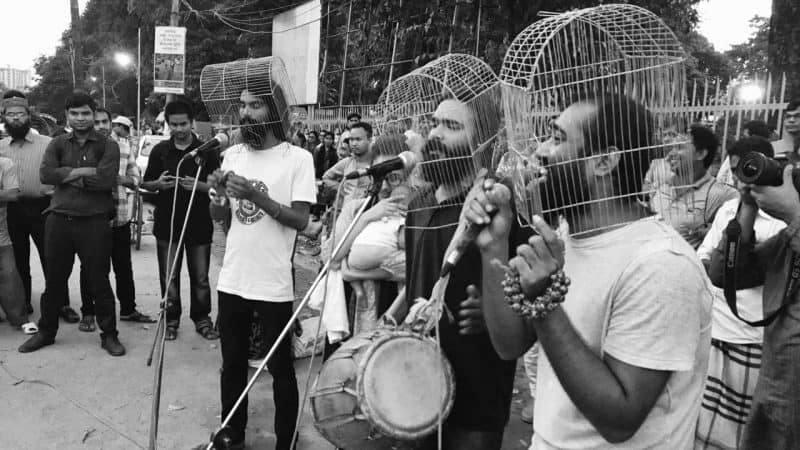 “Let Democracy be free”. An innovative protest in Shahbag Square in Dhaka, demanding the release of Shahidul Alam. Image by Pranabesh Das, used with permission.