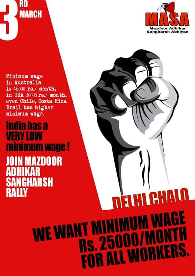 The Mazdoor Adhikar Sangharsh Abhiyan (MASA) has organised a workers’ march from Ramlila Maidan to Parliament Street on March 3, against the Narendra Modi-led Bharatiya Janata Party (BJP) government’s attempts to weaken the labour laws and privatise the public sector.