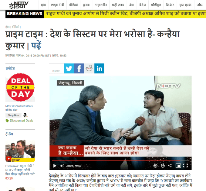 The interview pertained to the 2016 JNU sedition row. At about 37:16 minutes into the video, Ravish Kumar says, “ये बहुत तर्क चल रहा है कि सीमा पर जवान शहीद हो रहे हैं और आप इस तरह से मिनिमम यूनिटी जैसी अय्य़ाशी जैसी बात कर रहे हैं। सब आप पढ़े लिखे लोग हैं, आप ऐसी बातें क्यों कर रहे हैं? ये चल रहा है, खथरनाक सा सवाल है और कई बार तो लगता है इसका जवाब ही नहीं होता है। आपने कहा था आपके भाई की शहादत हई थी सीआरपीएफ में थे, नक्सलियों से लड़ते हुए। कभी आपको लगा कि आप उनकी शहादत को कमतर कर रहे हैं..”