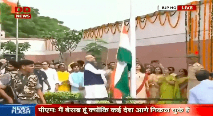 The flag hoisting was also tweeted live by BJP. It is interesting to note that even though BJP didn’t consider it necessary to delete the tweet, Doordarshan felt a need for self-censorship. The tweet and the video were still available on BJP site at the time of writing the article.