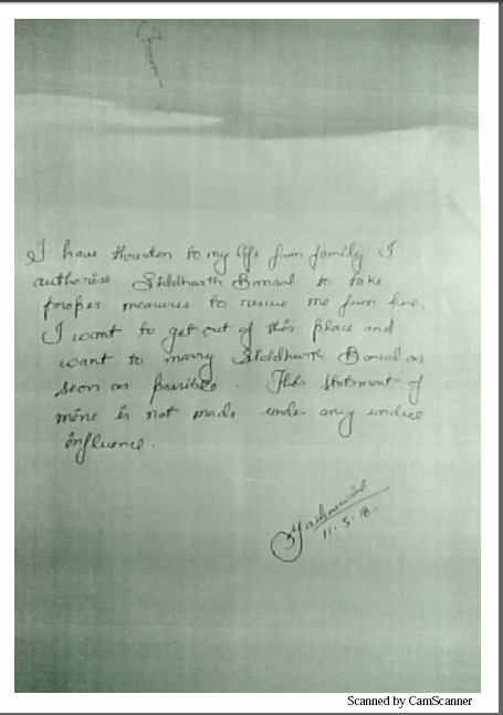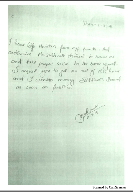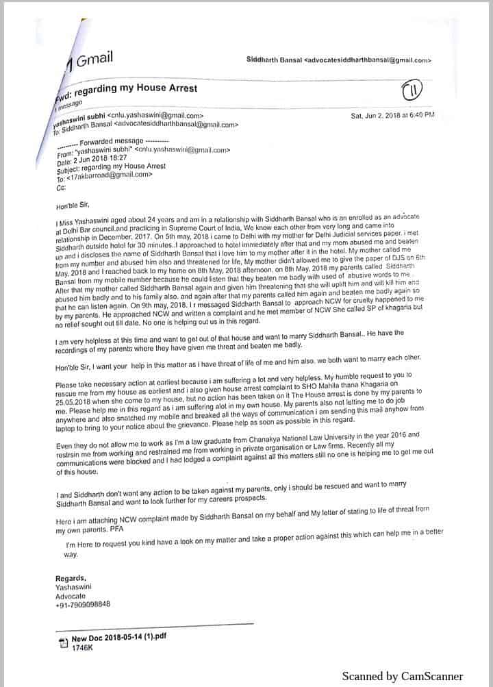 May 11, 2018: Yashaswini writes to Siddharth Bansal saying her life is under threat