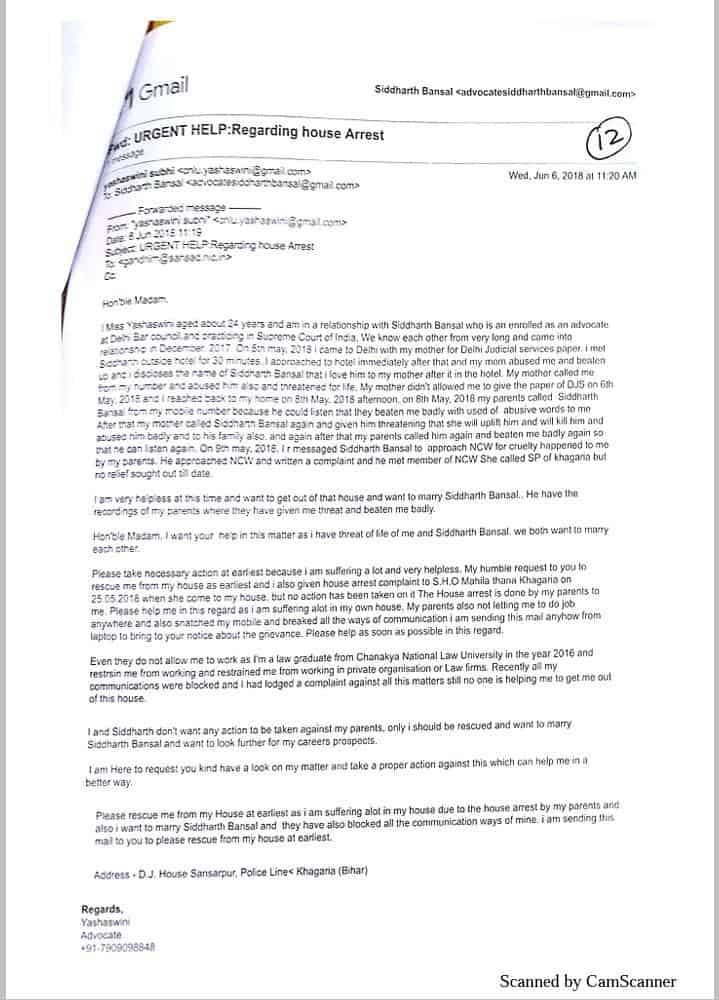 “On  June 2, she e-mailed Home Minister Rajnath Singh. On June 4, she wrote to Union Minister Maneka Gandhi too. She also narrated her grievance to NCW chairperson Rekha Sharma, Bihar DGP KS Dwivedi and Bihar State Women’s Commission member Savita Natrajan in separate e-mails. But, nobody came forward to help her and take her out from the illegal confinement of her parents,” Bansal said.