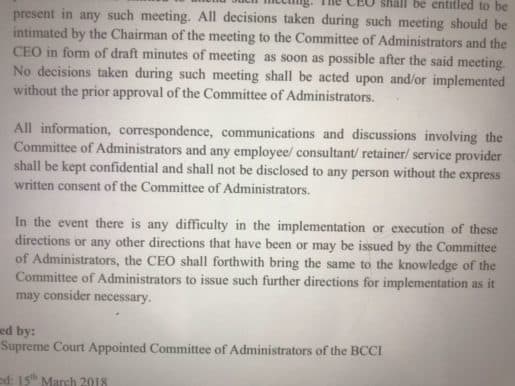 In a new twist to the ongoing battle between BCCI office bearers and the Supreme Court appointed Committee of Administrators, the CoA issued new directions for the Cricket board. In a document (in possession of News Central), the CoA, led by former CAG, Vinod Rai, informs the BCCI office bearers that they will be “bound to act in accordance with the directions of the Committee of Administrators and shall aid, assist and cooperate with the CoA….”