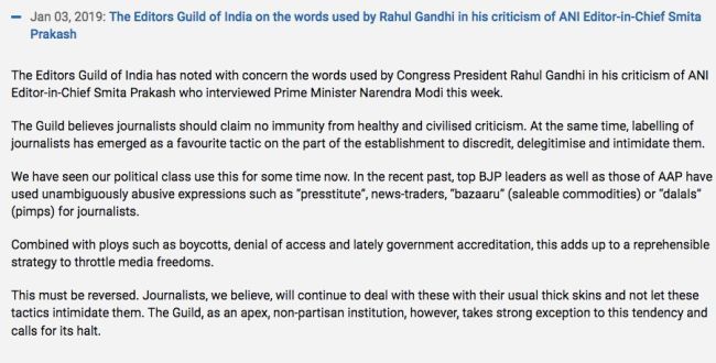 Others referred to the Guild’s silence on abuse that is hurled regularly at journalists by BJP leaders and ministers in an organised fashion, while PM Modi himself called journalists ‘Bazaru’ and ‘news-traders’. It was noteworthy that Modi had called journalists ‘news-traders’ in an interview to Smita Prakash who had smiled at the reply, without taking any offence or offering any rebuttal. While the Guild’s statement names Rahul Gandhi, Narendra Modi’s name has been conspicuously left out.