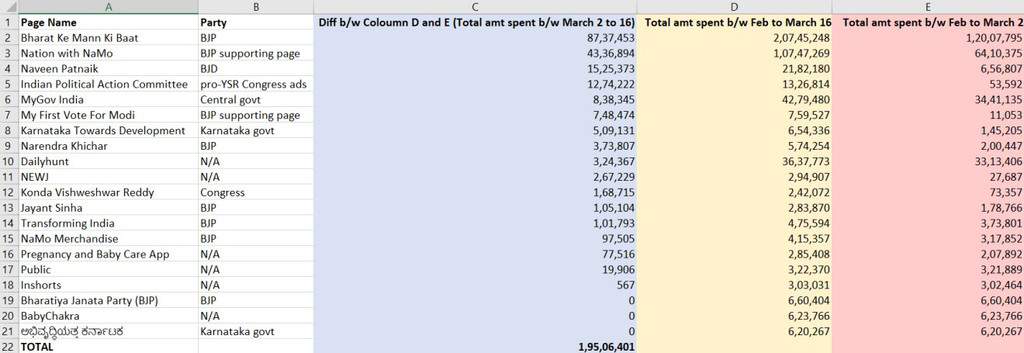 The table below shows the expenditure by the top 20 pages between March 2 to 16. This is reflected in Column C, which is the difference between total expenditure till March 16 (Column D) and total expenditure up to March 2 (Column E).