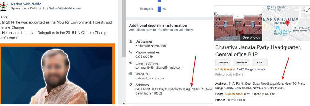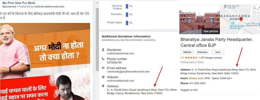 The sole lead that we have is the address provided by the pages, which matches BJP headquarters in Delhi. This raises two pertinent questions – one, does the BJP fund these pages to sponsor political ads favouring the party?; two, if the BJP is, in fact, responsible, has the investment been disclosed to the Election Commission?