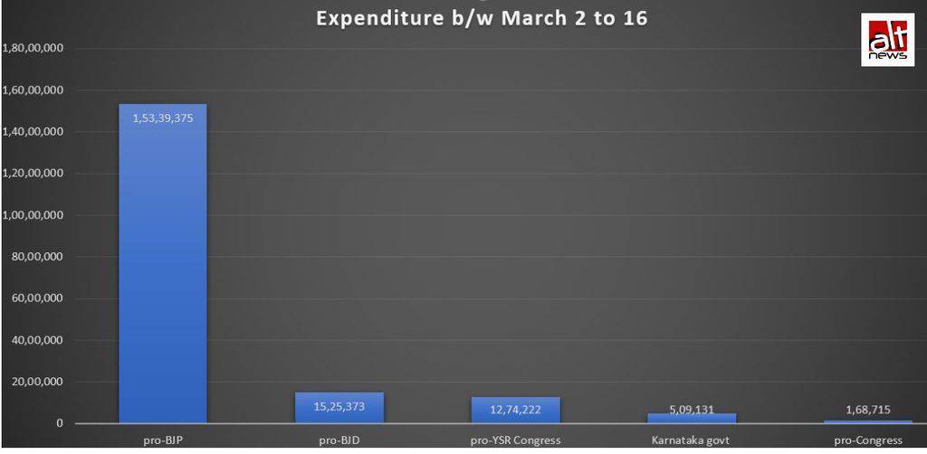 Out of this total expenditure, the top 20 pages alone contributed more than Rs 1.9 crore, with pro-BJP pages investing over Rs 1.5 crore. A distant second was pro-BJD ads at Rs 15.2 lakh, followed by pro-YSR Congress ads (Rs 12.7 lakh), ads by the Karnataka government (Rs 5 lakh) and pro-Congress pages (Rs 1.68 lakh).