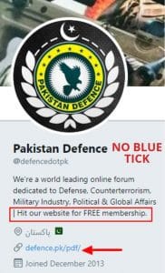 - The bio also includes a website – “defence.pk/pdf/”. This website lists @defencedotpk as its official Twitter handle. However, defence.pk is not the official website of Pakistan’s Ministry of Defence and was started as a forum to discuss issues pertaining to the Pakistani army. Any Pakistani government website ends with “gov.pk” and the URL of the official website of the defence ministry is mod.gov.pk.