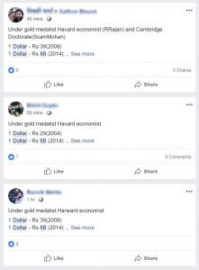 “Under gold medalist Havard economist 1 Dollar – Rs 39(2008) 1 Dollar – Rs 68 (2014) Under Chaiwala 1 Dollar – Rs 68(2014) 1 Dollar – Rs 69(2018) What this all Ranty-Rona all about?” This message which is viral on social media makes a comparison between the exchange rate of United States Dollar(USD) to Indian Rupee(INR) during the term of “gold medalist Havard economist” (Former Prime Minister Manmohan Singh) and “Chaiwala” (Prime Minister Narendra Modi).