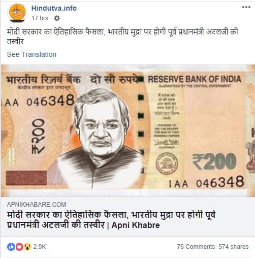 An article recently viral on social media suggests that the PM Modi-led government has taken a “historic step” of printing Indian currency notes featuring former prime minister late Atal Bihari Vajpayee. “मोदी सरकार का ऐतिहासिक फैसला, भारतीय मुद्रा पर होगी पूर्व प्रधानमंत्री अटलजी की तस्वीर (Modi government’s historic decision, Indian currency will feature the image of former prime minister Atalji),” reads the title of the report by a website called apnikhabare.com, which showcases a Rs 200 note with the photograph of the ex-PM. From a Facebook page Hindutva.info, the article received nearly 3,000 likes and over 500 shares.