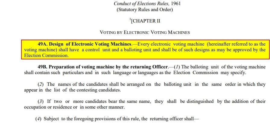 According to the Conduct of Elections Rules, 1961, section 49A is titled Design of Electronic Voting Machines. It does not refer to ‘challenge vote’ as claimed in the viral message. The section reads: “Every electronic voting machine (hereinafter referred to as the voting machine) shall have a control unit and a ballotting unit and shall be of such designs as may be approved by the Election Commission.”