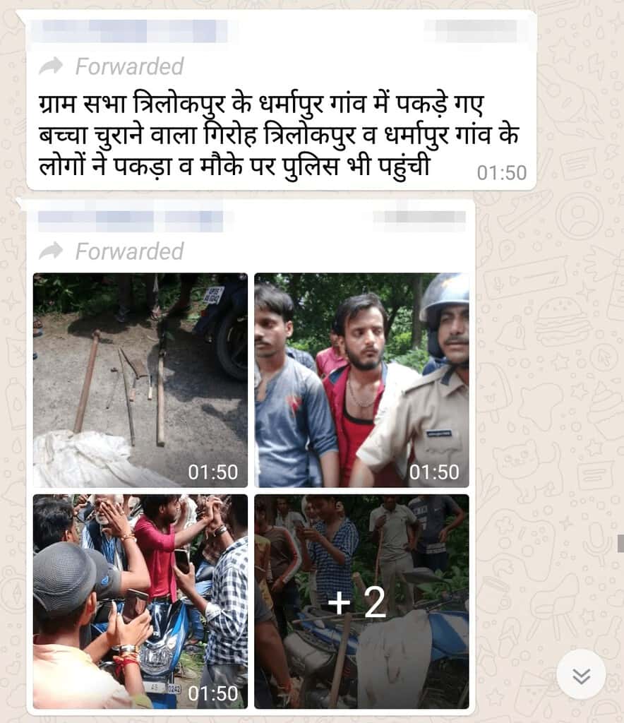 Two videos of an angry mob beating three men are circulating on WhatsApp with the claim that residents of Trilokpur gram sabha in Dharmapur village have caught a gang of child-kidnappers. “ग्राम सभा त्रिलोकपुर के धर्मापुर गांव में पकड़े गए बच्चा चुराने वाला गिरोह त्रिलोकपुर व धर्मापुर गांव के लोगों ने पकड़ा व मौके पर पुलिस भी पहुंची”, reads the WhatsApp text shared with two videos and photographs of the incident. Below is the screenshot of the WhatsApp forward.