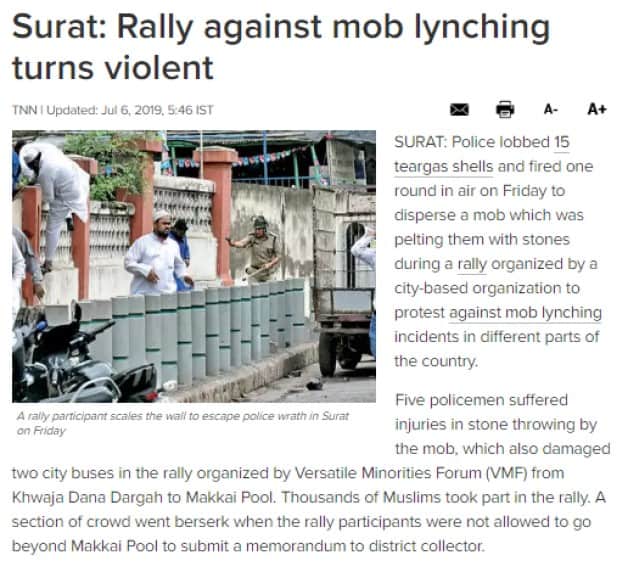 TV9 Gujarati also reported the incident. A rally to protest mob lynchings was taken out in Surat on July 5. The agitation, however, turned violence and mob began pelting stones. The Times of India reported, “A section of [the] crowd went berserk when the rally participants were not allowed to go beyond Makkai Pool to submit a memorandum to [the] district collector. According to the report, two buses were attacked. “The mob targeted a city bus near Take Off restaurant and broke its window panes and the other at another place,” it said.