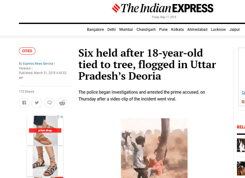 The video actually depicts a case of flogging in UP’s Deoria. The police arrested six people for beating an 18-year-old after tying him to a tree. “The victim was assaulted as [he] had reportedly asked one of the accused to return Rs 1,500 he had lent, they [police] said,” according to The Indian Express.