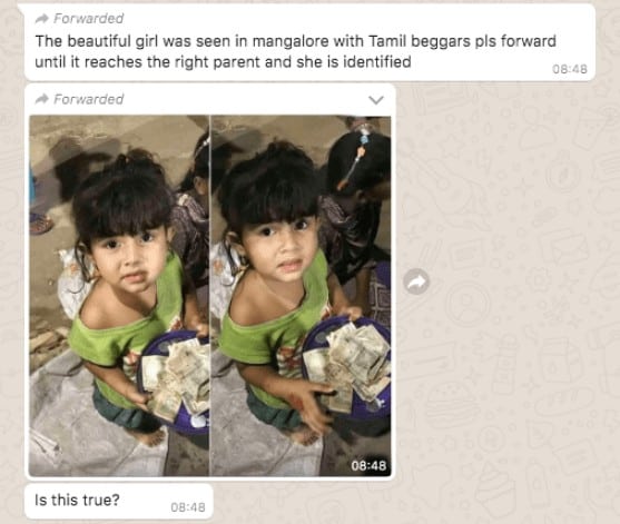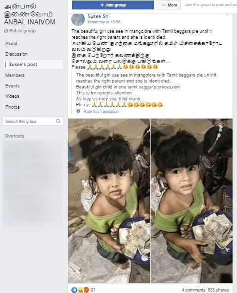 The same claim is also circulating with a Tamil text – “அழகிய பெண் குழந்தை மங்கலூரில் தமிழ் பிச்சைக்காரோட வலம் வ௫கிறது இதை பெற்றோர் கவணத்திற்கு சொல்லும் வரை பல௫க்கு பகி௫ங்கள். (The beautiful girl was seen in Mangalore with Tamil beggars pls forward until it reaches the right parent and she is identified. This is for the parent’s attention.)”
