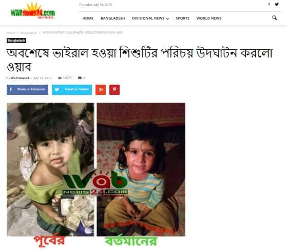 We found another local report by WAB News24, according to which, a different family has recognised the child in the photographs as their own. Volunteers of the organisation, while searching for the girl, came across a person who claimed to have spotted her at Brahmanbaria railway station. Taking this as a lead, WAB claimed to have located the child’s father, Abul Mia. Speaking to her family members and neighbours, WAB claimed that the girl in the pictures was Abul Mia’s daughter and not the child who was kidnapped.