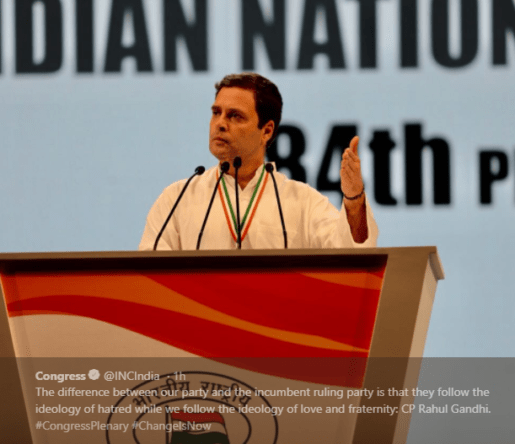 In his brief inaugural address at the 84th Congress Plenary session, Gandhi said the Congress’s hand (election symbol) is the only one that would unite India and take it forward, and reminded partymen that it followed the ideology of love.
