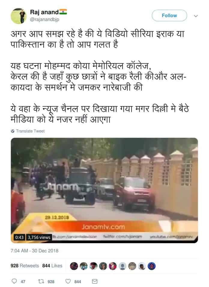 “IS – Al Qaeda organizations take roots in Kerala; in the Capital, students demonstrate raising flags of these terror organizations- translated”, read the headline of a news report published by Kerala’s regional news channel Janam TV on December 29.