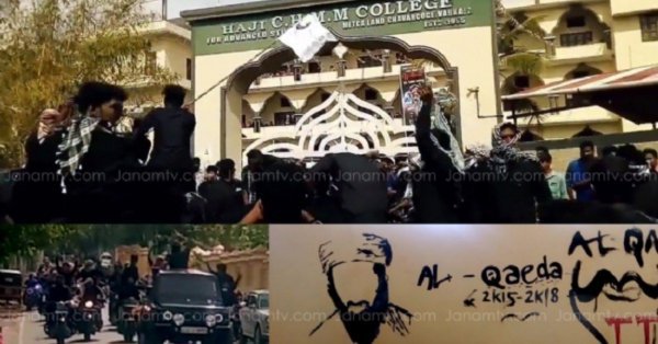 @TVJanam released visuals of college students rallying in solidarity with terrorist organisations like ISIS& Al-Qaeda and graffiti glorifying Osama bin Laden on a college campus in Varkala, Tvm. Students spotted wearing ‘terrorist costumes’ in the video.https://t.co/isDKt75rwK pic.twitter.com/JnMgYuy1td