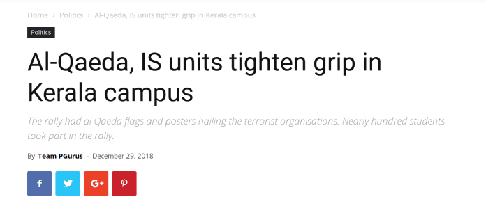 PGurus, a right-wing mouthpiece based in the USA has also published an article on December 29, 2018. The website also quoted a senior intelligence official saying, “We are sure that there are IS and Al Qaeda elements operating in college because such rallies can never form the part of college day celebrations”.