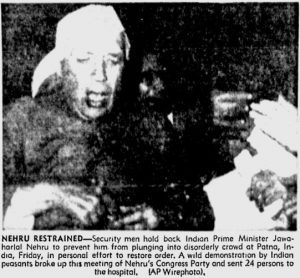 Another publication The Florence Times, on January 8, 1962, had also reported the incident as – “Security men hold back Indian Prime Minister Jawaharlal Nehru to prevent him from plunging into a disorderly crowd in Patna, India, Friday, in personal effort to restore order. A wild demonstration by Indian peasants broke up this meeting of Nehru’s Congress Party and set 24 persons to the hospital.”