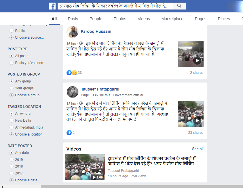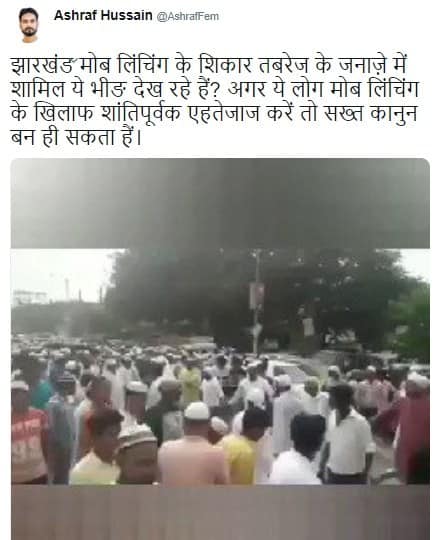 “झारखंड मोब लिंचिंग के शिकार तबरेज के जनाज़े में शामिल ये भीङ देख रहे हैं? अगर ये लोग मोब लिंचिंग के खिलाफ शांतिपूर्वक एहतेजाज करें तो सख्त कानुन बन ही सकता हैं।” (Do you see the crowd gathered at the funeral of Jharkhand mob lynching victim Tabrez Ansari. If they protest peacefully against mob lynching then a stringent law can be enacted- translation).