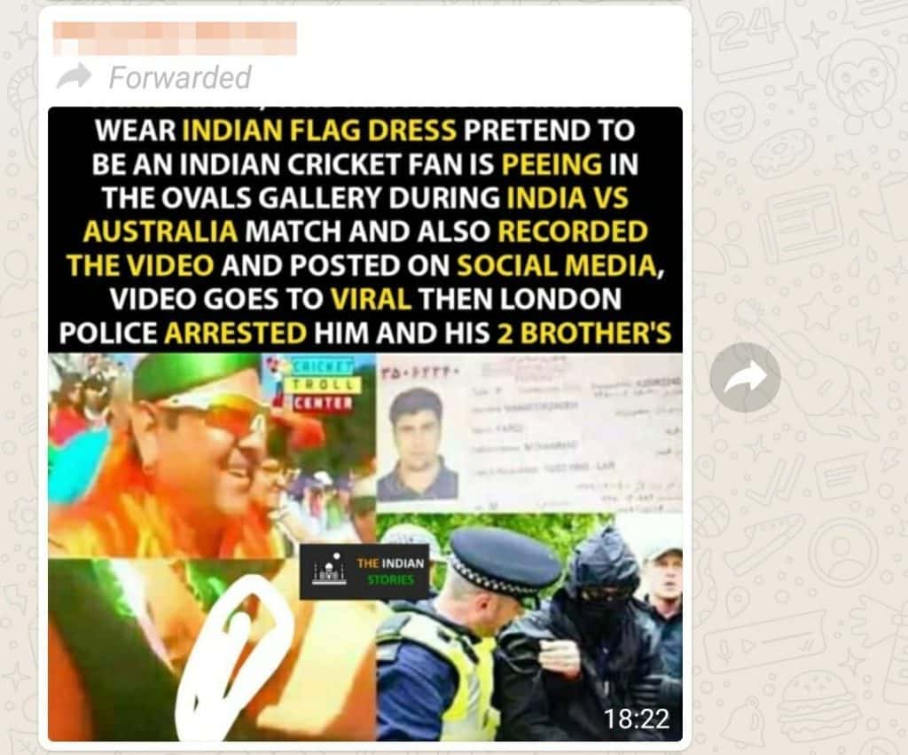 A poster shared on social media claimed that a Pakistani man masquerading as an Indian cricket fan was urinating at The Oval, London, during the India vs Australia game. A collage of photographs, where a man dressed in the Indian tricolour can be seen, was also shared along with the poster. The text reads, “Farid Khan, this man from Pakistan wear Indian flag dress pretend to be an Indian cricket fan is peeing in The Oval gallery during India v/s Australia match and also recorded the video and posted on social media, video goes to viral then London police arrested him and his 2 brothers. Such a shameful act by Pakistani citizen”. It suggested that a Pakistani citizen attempted to tarnish India’s image by pretending to be an Indian fan who indulged in the obscenity.