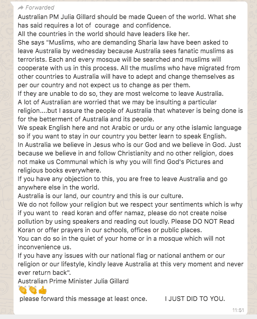 4.  Misinformation: Australian PM Julia Gillard asking Muslims to leave the country