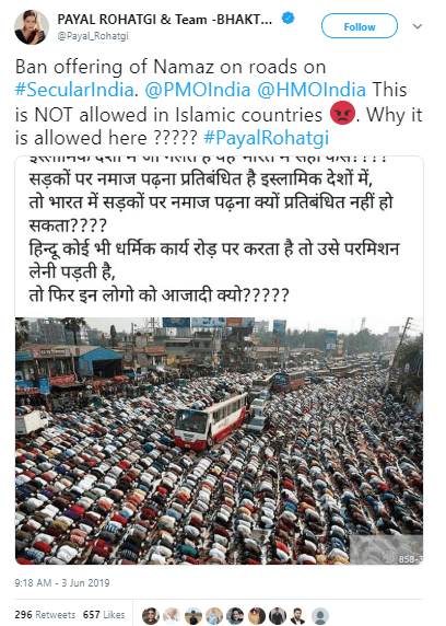 “Ban offering of Namaz on roads on #SecularIndia. @PMOIndia @HMOIndia This is NOT allowed in Islamic countries. Why it is allowed here ????? #PayalRohatgi,” read a June 3 tweet by Payal Rohatgi where she shared a photograph of hundreds of people offering Namaz on the road, thus blocking traffic.