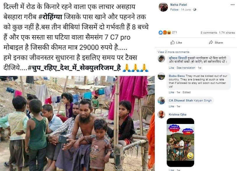 A Facebook user shared an image of a man surrounded by children. According to the text attached to the photograph, he is a Rohingya Muslim who has no food to eat or clothes to wear but has three wives and eight children. It further claimed that the man also has a mobile phone worth Rs 29,000.