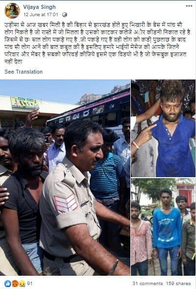 A rumour viral on social media claimed that organ smugglers are killing innocents to sell their body parts. The message circulating in Telugu claimed that 500 people travelling from Bihar to Jharkhand, disguised as beggars, are killing people to sell their bodies and kidneys to medical colleges and illegal organ trade businesses. The rumour suggested that six to seven perpetrators have been caught by the police. The message was also circulated in Hindi.